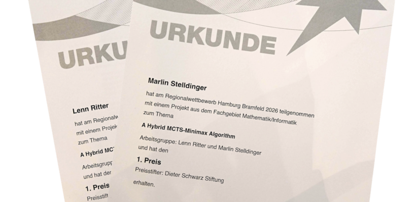 Lenn Ritter (S2) und Marlin Stelldinger (macht zur Zeit ein Auslandsjahr in Australien) haben heute beim Regionalwettbewerb Jugend Forscht im Fachgebiet Mathematik/Informatik mit ihrer Arbeit „A Hybrid MCTS-Minimax Algorithm“ den ersten Preis sowie zwei Sonderpreise gewonnen. Damit haben sie sich souverän für den Landeswettbewerb im April qualifiziert.