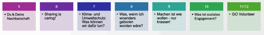 Jeder Jahrgang setzt sich im Verlauf des Schuljahres mit einem bestimmten Schwerpunkt auseinander. Die Themen reichen von Nachbarschaftshilfe und Hilfe für Ältere, über Bücher- und Kleiderspende bis zum Einsatz für die Natur. In den höheren Jahrgängen steht dann die Auseinandersetzung mit “Was bedeutet sozial für mich und was kann ich tun?” im Mittelpunkt. Dabei gibt es schulinterne Projekte, aber auch außerschulische Lernorte. Ziel ist die aktive Auseinandersetzung mit und Sensibilisierung für soziale und nachhaltige Themen. Geplant und umgesetzt werden die Projekte durch die AG “Soziales Engagement”, bestehend aus Lehrkräften und engagierten Eltern. Hier eine Auswahl der aktuellen Projekte: