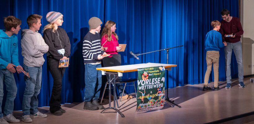 Neun Klassensiegerinnen und -sieger – jeweils zwei aus jeder Klasse – traten an, um zunächst ihr mitgebrachtes Buch kurz vorzustellen und anschließend einen spannenden oder berührenden Abschnitt daraus vorzulesen.